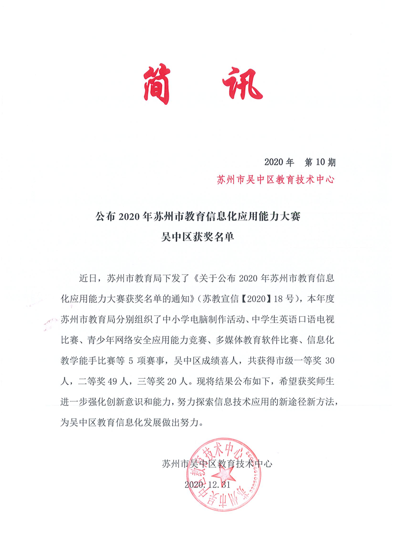 关于公布2020年苏州市教育信息化应用能力大赛获奖名单的通知